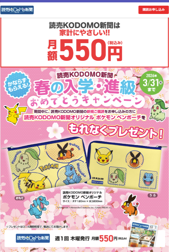 【PR】読売KODOMO新聞 今回は、毎週木曜日に発行されている小学生向けの新聞のご紹介です!サイズは、小学生が手に取りやすいタブロイド判。 20ページある紙面は、オールカラーです。この新聞ではイラストや写真を大きく使ったビジュアルなレイアウトで話題のニュースや社会の仕組みを楽しく、 わかりやすくお伝えされています。楽しい読み物や学習コーナーを、 さらに夏休みには自由研究新聞、受験シーズンには某大手学習塾監修の受験新聞を別刷りで発行し、 特別付録としてこちらの新聞と一緒にお届けしているとの事です。◆おすすめポイント◆こちらのサイトでは3か月以上の購読申込特典として、某人気キャラクターの漢字ポスターや熟語ドリルなどの 子どもの学びに役立つグッズの中から1点をプレゼントしているそうです!その他期間限定のキャンペーンも♪毎週木曜日発行 月額550円(税込)中学生・高校生のお子さまがいる方には中高生新聞(毎週金曜日発行、税込850円/月)がおすすめとの事です。 こちらをクリック おすすめ情報 ↓↓下のバナーをクリック↓↓ 商材名 読売KODOMO新聞運営者 CK※当サイトはアフィリエイトプログラムを利用し宣伝目的で作成しております。